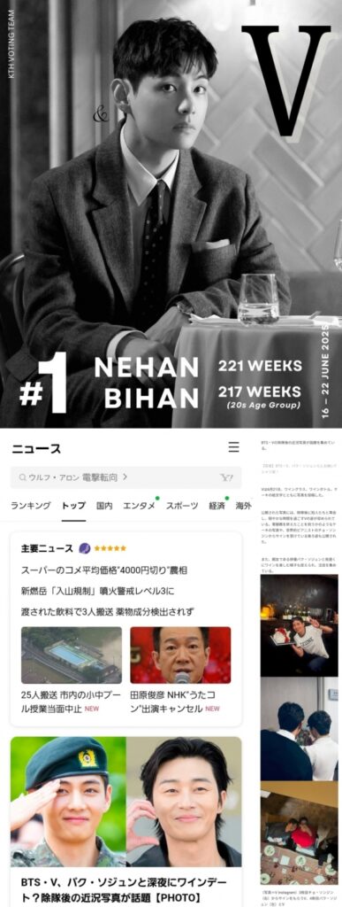 Setelah V membagikan foto aktivitasnya di Instagram pada 21 Juni, LINE News Jepang langsung menjadikannya headline utama dengan judul: