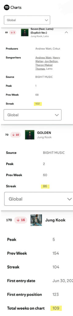 • 102 Minggu di Tangga Lagu Global Spotify untuk Lagu, 86 Minggu untuk Album — Rekor Baru Solois Asia