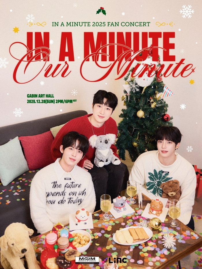 IN A MINUTE telah mengumumkan jadwal fan concert mereka yang bertajuk ‘IN A MINUTE : OUR MINUTE’. Acara ini akan berlangsung pada tanggal 28 Desember mendatang, dengan dua sesi pertunjukan: pukul 14.00 KST dan 18.00 KST, bertempat di Gabin Art Hall, Seoul. Ini menandai momen penting bagi mereka.