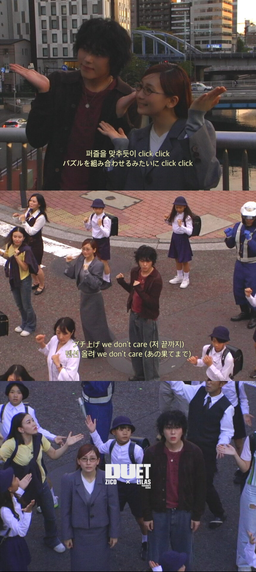 Lirik ‘DUET‘ secara sempurna menangkap esensi pertemuan dua kekuatan musik ini. Baris puitis seperti “Tokyo to Seoul, 時空を超えて” (Tokyo ke Seoul, melampaui ruang dan waktu) dan “二人で重ねる melody” (Melodi yang kita bangun bersama), menyatukan bahasa Jepang dan Korea dengan mulus. Kemudian, ZICO menampilkan alirannya yang khas: “정반대의 음색, 따로 노는 그림체” (Timbre yang berlawanan, palet yang berbeda) dan “물감을 섞듯이 swirl swirl 연주해 Let’s duet” (Seperti mencampur cat, berputar-putar, mainkan, Mari berduet). Kedua artis dengan cerdas menuangkan warna musik unik mereka ke dalam bagian masing-masing, menciptakan paduan yang sangat harmonis.