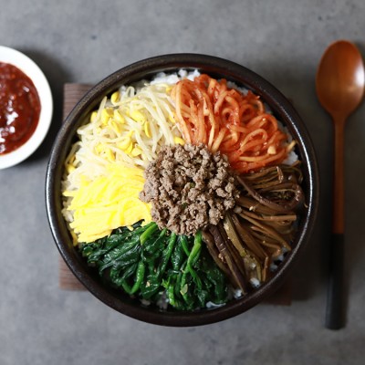 Nasi dengan aneka sayur, daging, telur, dan gochujang (saus cabai khas Korea), yang dicampur sebelum dimakan.