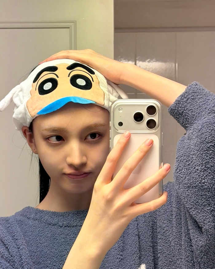Yang paling menarik perhatian adalah foto Liz dengan hiasan kepala Crayon Shin-chan. Bagi banyak orang yang akrab dengan budaya pop Korea, Shin-chan bukan hanya sekadar karakter kartun; dia adalah simbol masa kecil yang nakal namun menghibur. Keputusan Liz untuk mengenakan aksesori ini, alih-alih merusak citranya sebagai idola, justru memperkuat daya tariknya. Kita bisa melihat:
