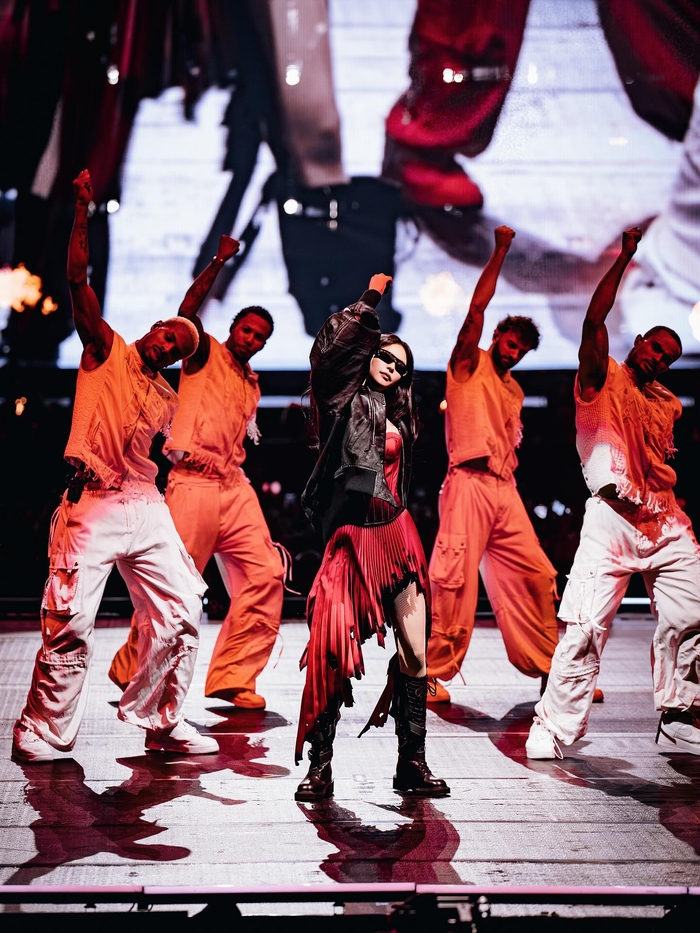 Penampilan Jennie kali ini benar-benar bikin mata terpaku! Bagaimana tidak, ia tampil super berani dan karismatik dengan kostum panggung yang mencuri perhatian. Pasalnya, Jennie mengenakan gaun mini korset merah yang begitu menggoda, dipadukan dengan jaket kulit hitam dan kacamata hitam. Transformasi dari “Human Chanel” menjadi “Wild Sexy Diva” ini memang bukan kaleng-kaleng, Sobat! 🤩
