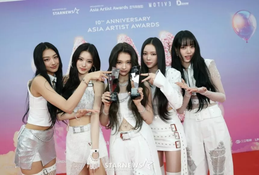 Girl group MEOVV pose setelah menerima penghargaan di 10th Anniversary Asia Artist Awards 2025 di Gaohsiung National Stadium.