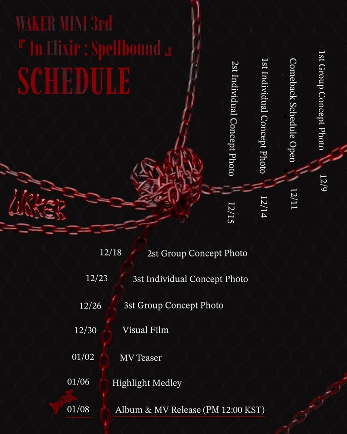 Pada tanggal 11 Desember 2025 pukul 00:00 KST, WAKER merilis gambar jadwal promosi untuk mini album ketiga mereka yang berjudul ‘In Elixir : Spellbound’ melalui saluran media sosial resmi mereka. Pengumuman ini mengonfirmasi persiapan intensif grup untuk kembali menyapa penggemar global.