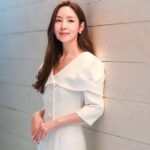 Untuk rambut, ia memilih gaya bun tinggi yang rapi dengan poni depan natural, memberi aura lembut. Perhiasan minimalis dan *tone* keseluruhan *ivory-beige* bikin look-nya makin elegan tanpa berlebihan. Benar-benar sebuah pernyataan gaya yang kuat tapi tetap berkelas. 🎧